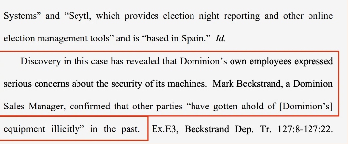 — Discovery in this case has revealed that Dominion’s own employees expressed serious concerns about the security of its machines. Mark Beckstrand, a Dominion Sales Manager, confirmed that other parties “have gotten ahold of [Dominion’s] equipment illicitly” in the past.